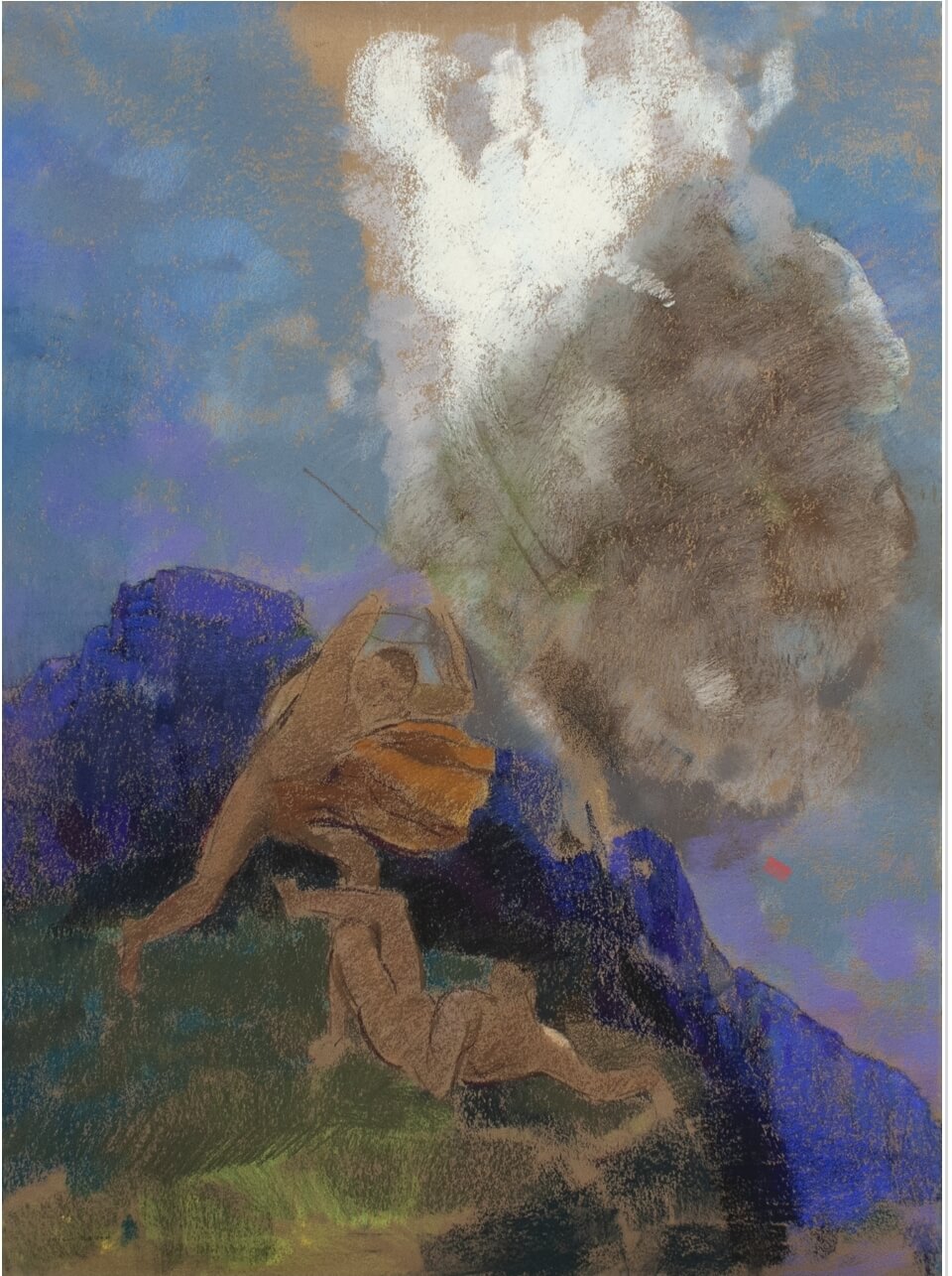 The incandescent blue fantasies of Odilon Redon are rooted in poetry. The original textual basis of Cain and Abel is obvious, but Redon draws his mystical blues from the deeper fathoms of French poetry, particularly Stephane Mallarme’s “l’azur,” the single most meaningful color for all the Symbolists. When J K. Huysmans included Redon by name in his decadent novel Against the Grain, this supremely talented but difficult-to-categorize artist from Bordeaux, whose early work had been included in exhibitions of the Impressionists, was catapulted into literary renown. By the end of this career, his disturbing paintings of eyes as colossal hot-air balloons made him a bridge to Surrealism. What makes Redon’s blue so important? By turning up the volume using the purest pigment (pastel is ground pigment with a binder) he liberates color, as did Matisse, to act as a light source. In his own words, the medium leads the way: “Materials have secrets to reveal; they have their own genius; it is through them that the oracle speaks.” Just in terms of the studio world of nineteenth-century Paris, Redon’s career began in the period of “violetomania” (the Societe Anonyme which Monet, Manet, Cezanne and Pissarro founded in 1874 was known for “always proceeding from a violet and bluish range”) and proceeded to the cooler, purer versions that became his signature in later years.